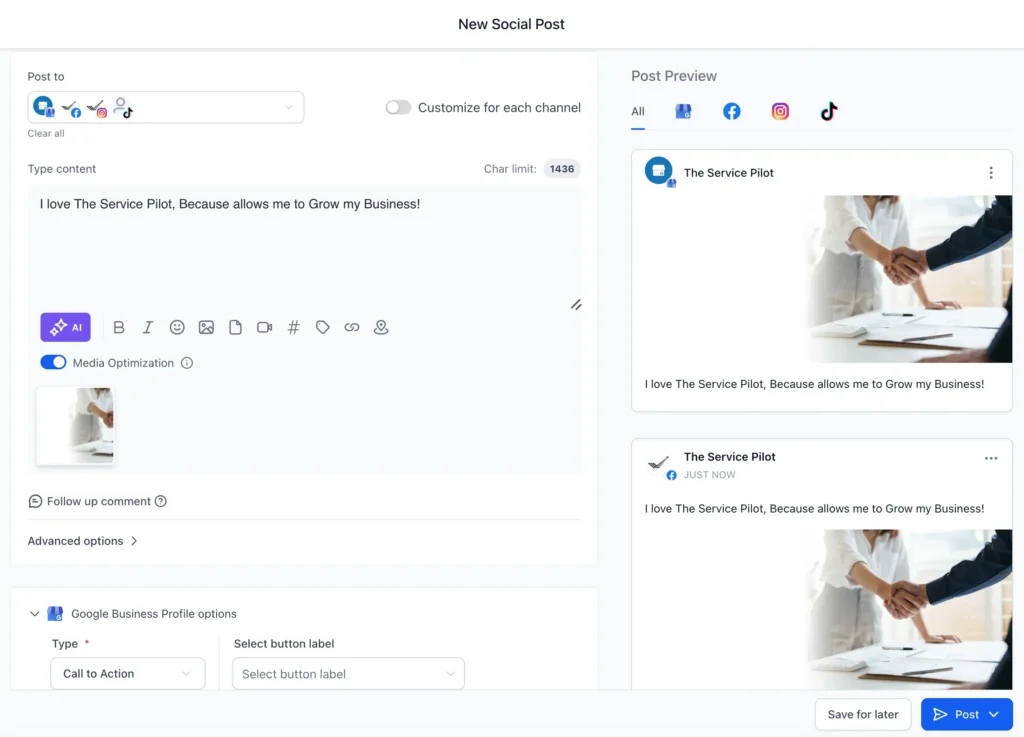 The Social Media Planner inside The Service Pilot lets you schedule, manage, and publish posts across multiple platforms from one dashboard—right alongside your CRM, calendar, and automation tools.